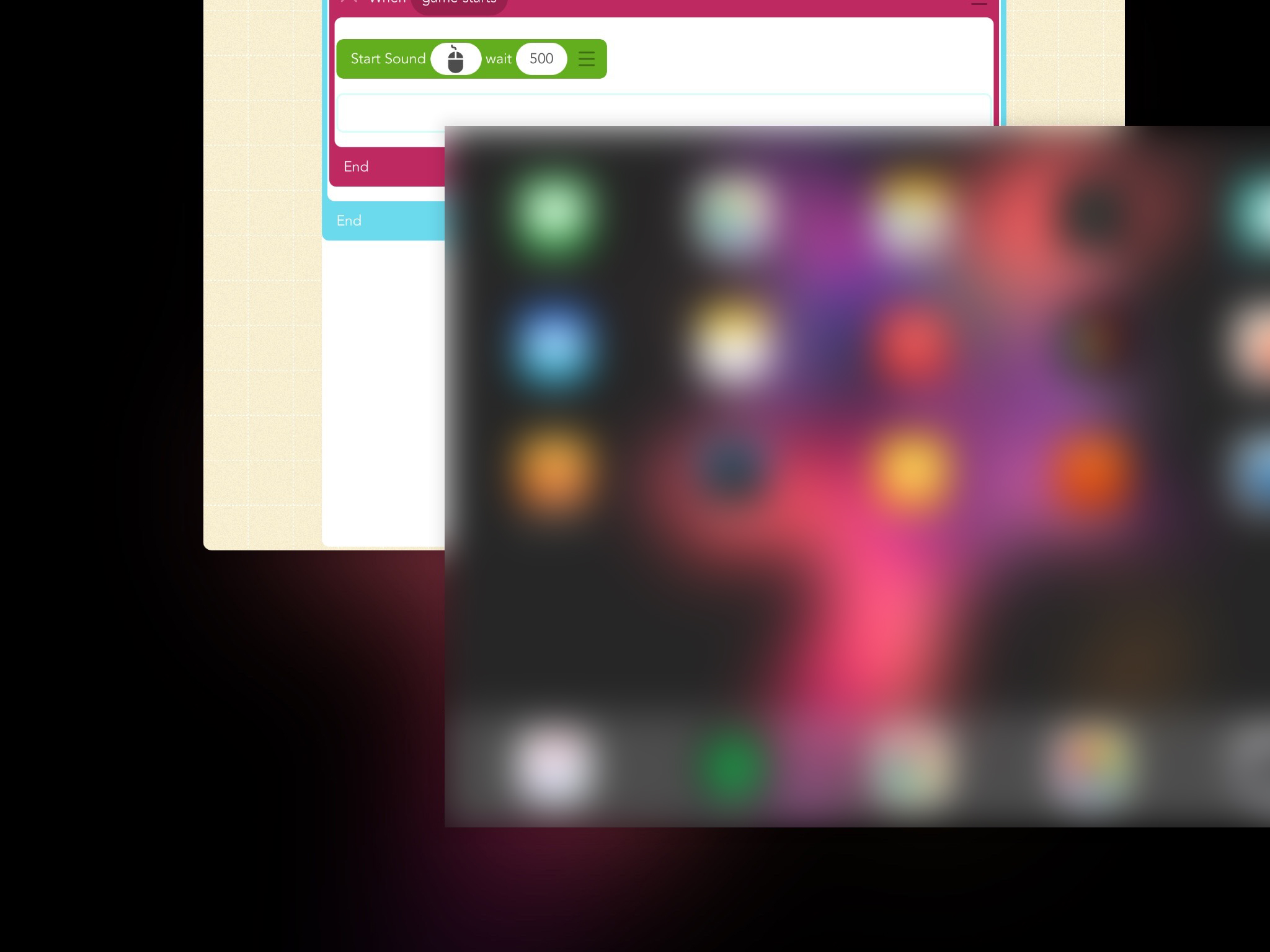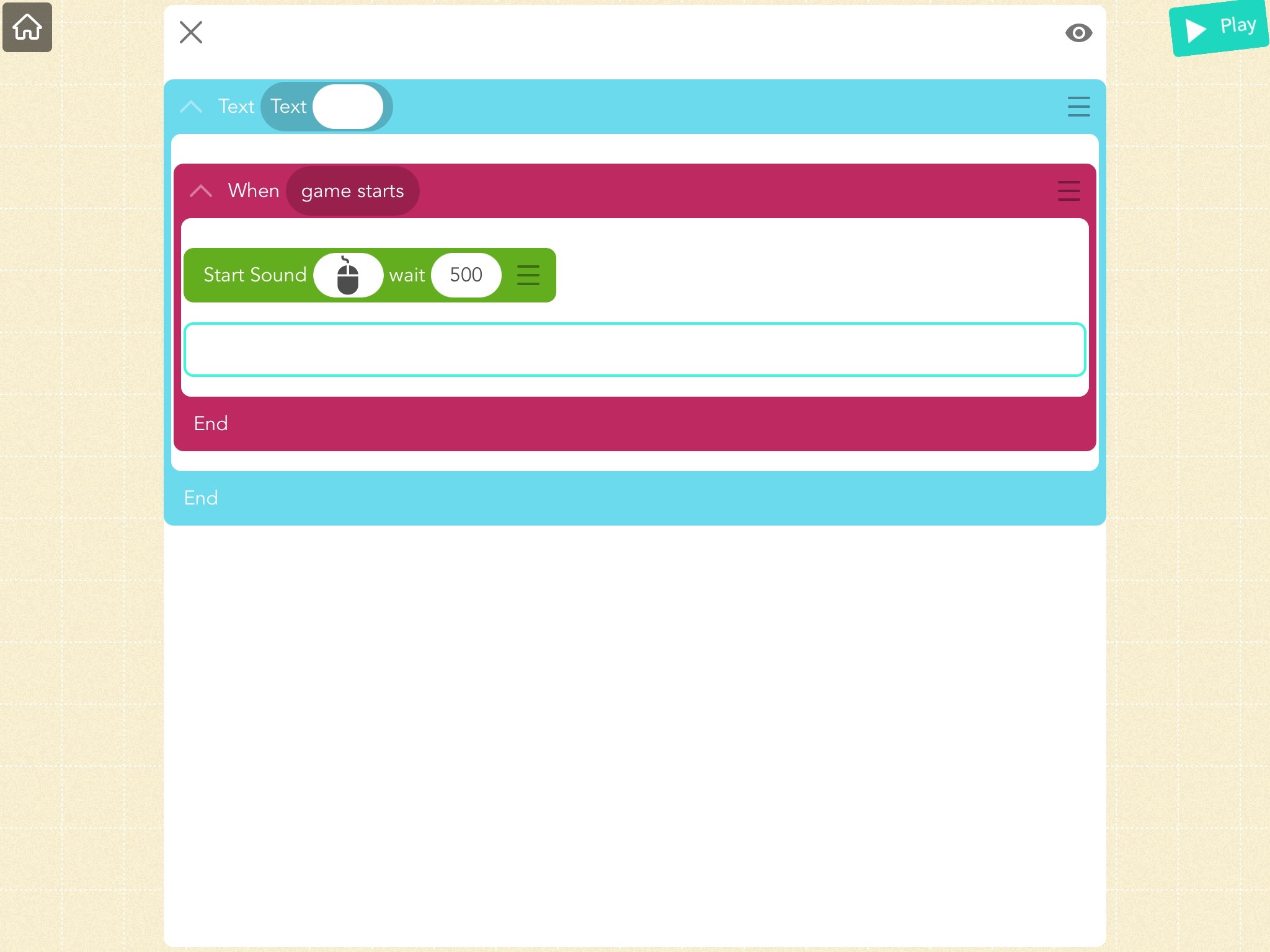 1. Make a new project in Hopscotch, add a blank text object and add the following code: When game starts: Start Sound (click) wait (500). The sound and wait does not matter.