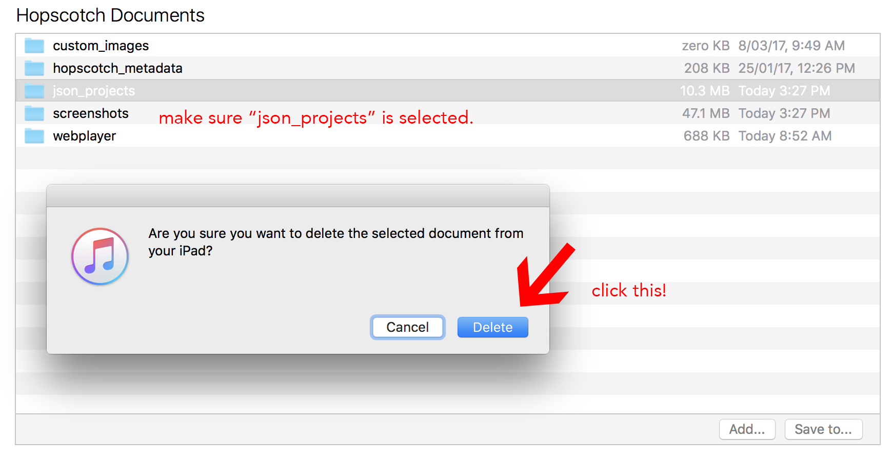 21. Under Hopscotch Documents select the “json_projects” folder and delete it.