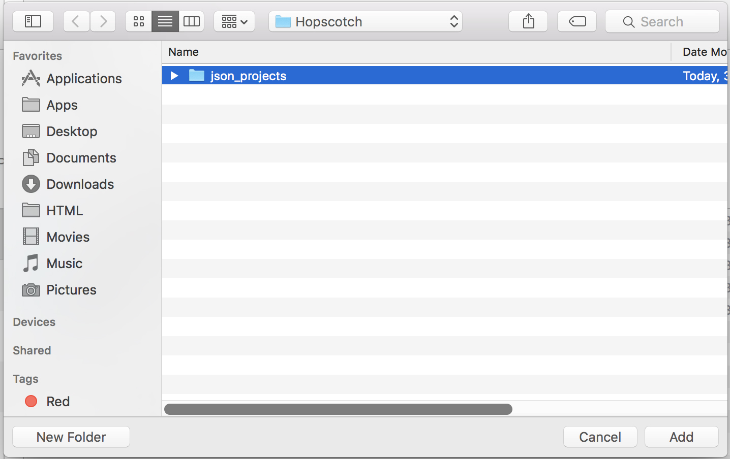 22. Click the “Add…” button (below the file browser) and find the “json_projects” folder you saved and add it to your iPad.